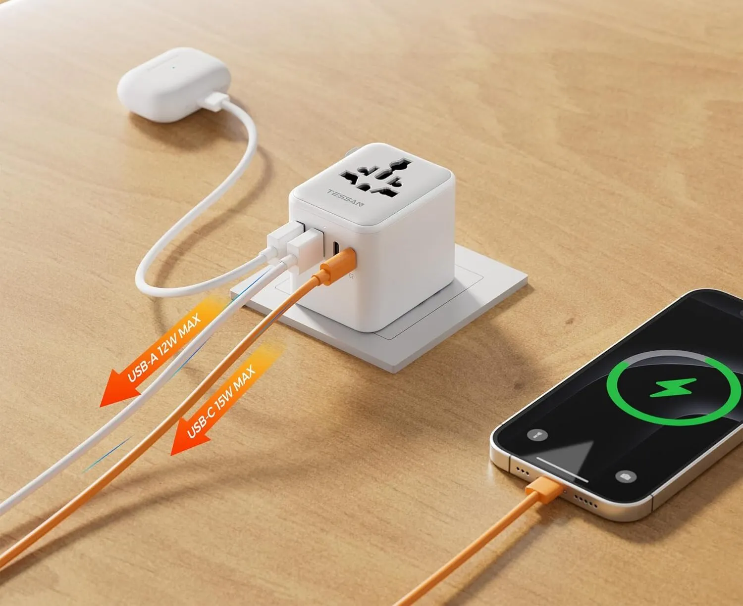 The combination of two USB‑C and two USB‑A ports gives the adapter enough flexibility to charge phones, tablets, headphones and other small electronics simultaneously. Output levels are suitable for everyday devices, although not intended for high‑wattage laptops or fast‑charging standards that require more advanced power delivery. The universal AC socket supports devices rated for the destination country’s voltage, and it aims to deliver stable charging performance across multiple regions. The adapter’s lack of voltage conversion is clearly stated, and it remains important for travellers to check their devices’ voltage compatibility before use.